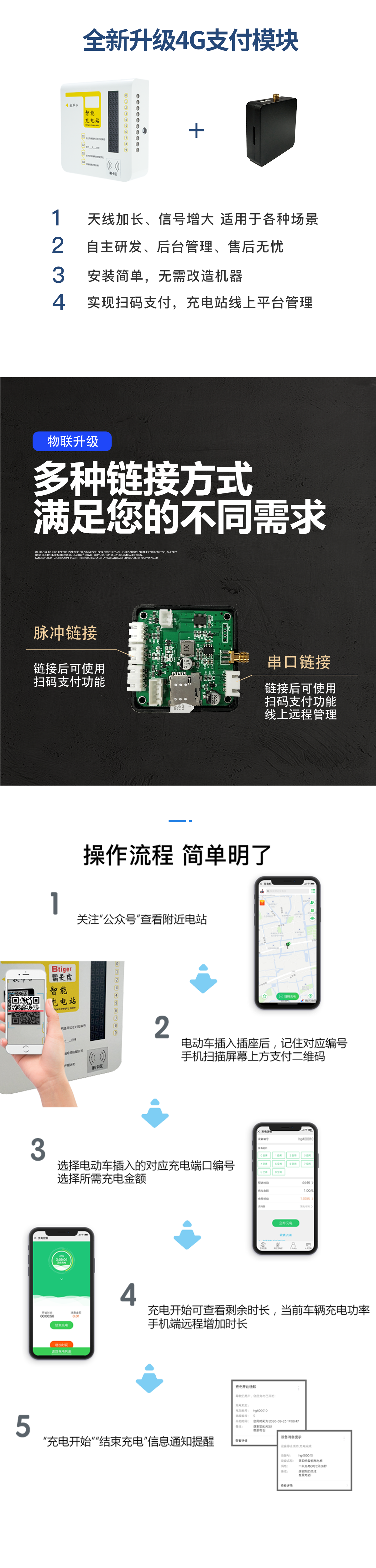 安裝便捷多種連接方式 物聯(lián),單機(jī)款設(shè)備鏈接支付盒子后均可實(shí)現(xiàn)掃碼支付、遠(yuǎn)程管理、實(shí)時查詢賬單、收益自動到賬、手機(jī)遠(yuǎn)程設(shè)置充電站功率區(qū)間計(jì)費(fèi);