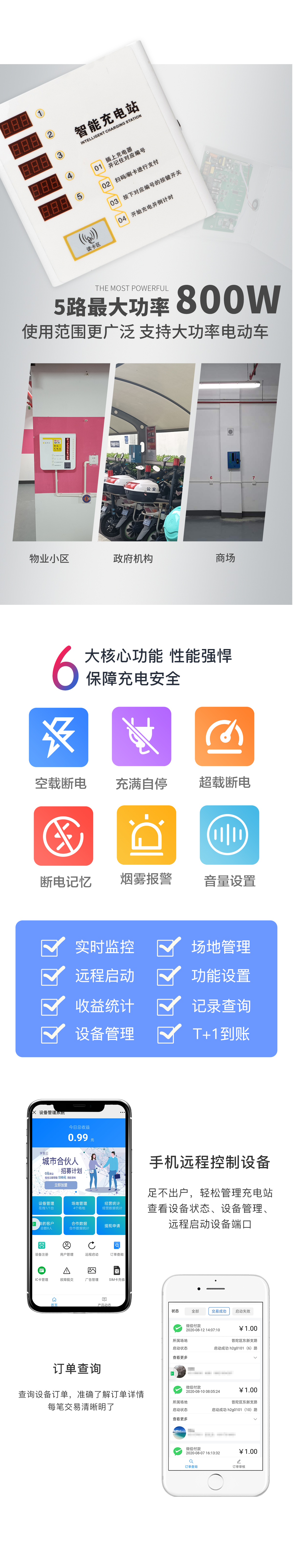 實時監測 | 遠程啟動 | 收益統計 | 設備管理 | 場地管理 | 功能設置 | 記錄到賬 | T+1到賬